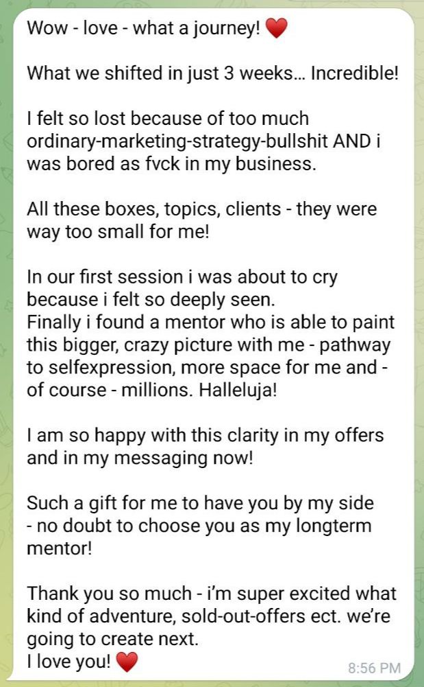 You receive a questionnaire so I can get to know your Human Design and Business more, and give you personal feedback on your next steps to focus on to grow your Business to 6-7 Figures in an aligned way faster, without working harder.
